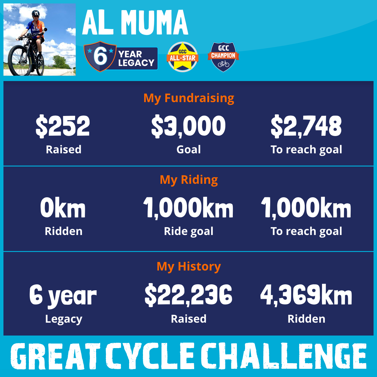 I'm back on my feet again and looking forward to pedaling my way past my goal this year and raising funds to help fight childhood cancer. This will certainly be a challenge for me, and I know that many of the 1,400+ children who are diagnosed with cancer every year would love to be able to do something like this, but unfortunately they often struggle just to get out of their hospital bed. Cancer is the biggest killer of children from disease in Canada and so I ride for them. Those children are facing challenges that I cannot even imagine yet they push on with the hope to be able to one day ride in the Great Cycle Challenge themselves..... a dream and hope that they strive for.