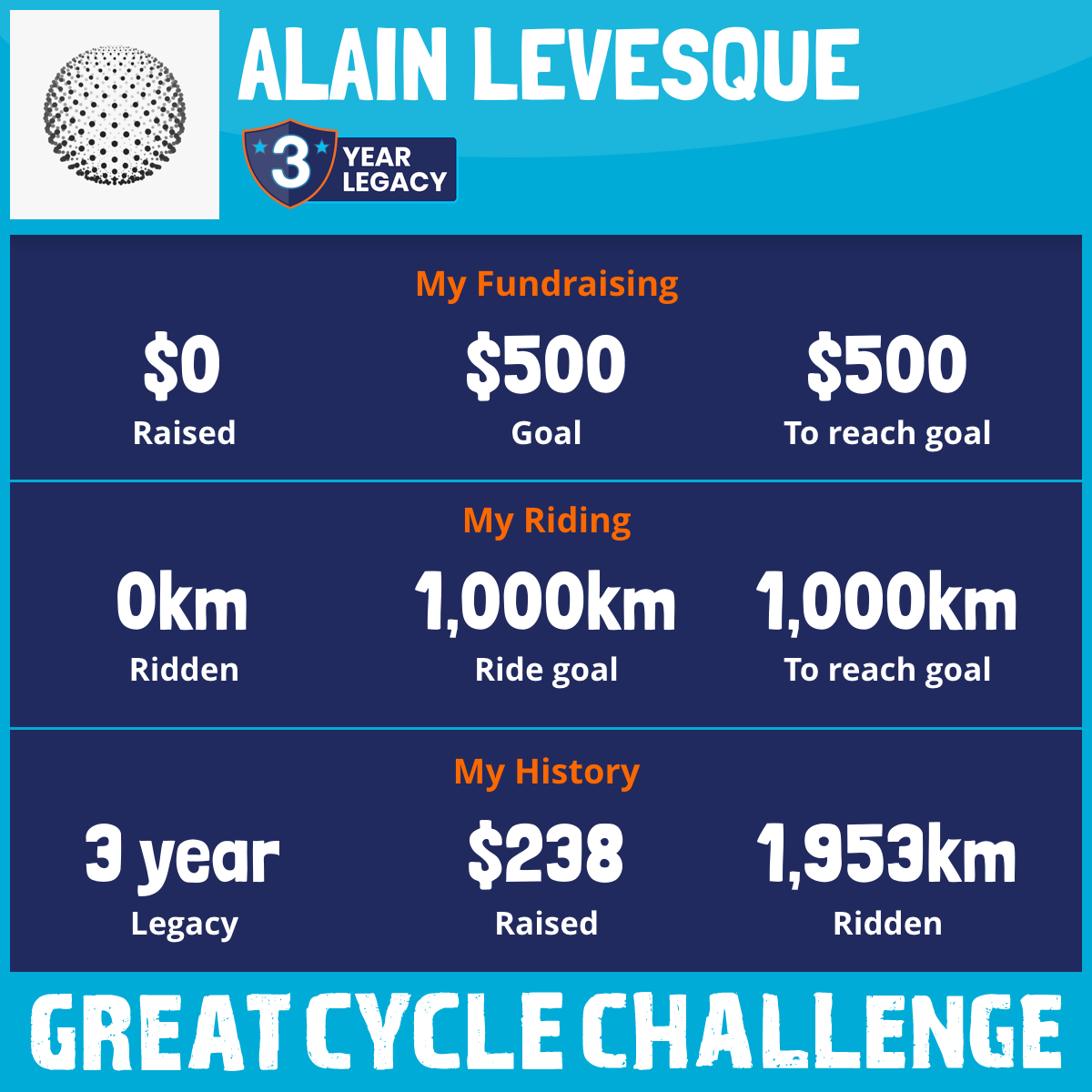 I am riding 1,000 km in memory of my dad, my father, Patrice Levesque. Please sponsor me and support my challenge to fight kids' cancer and save little lives.