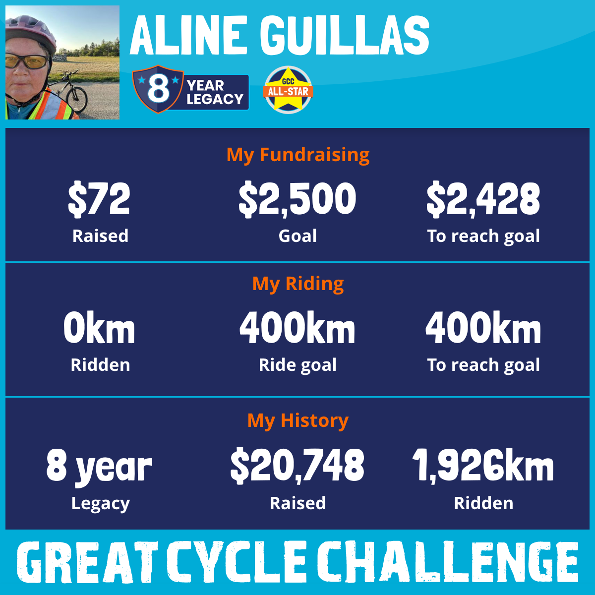 232 km Ridden$2,611 Raised2020
