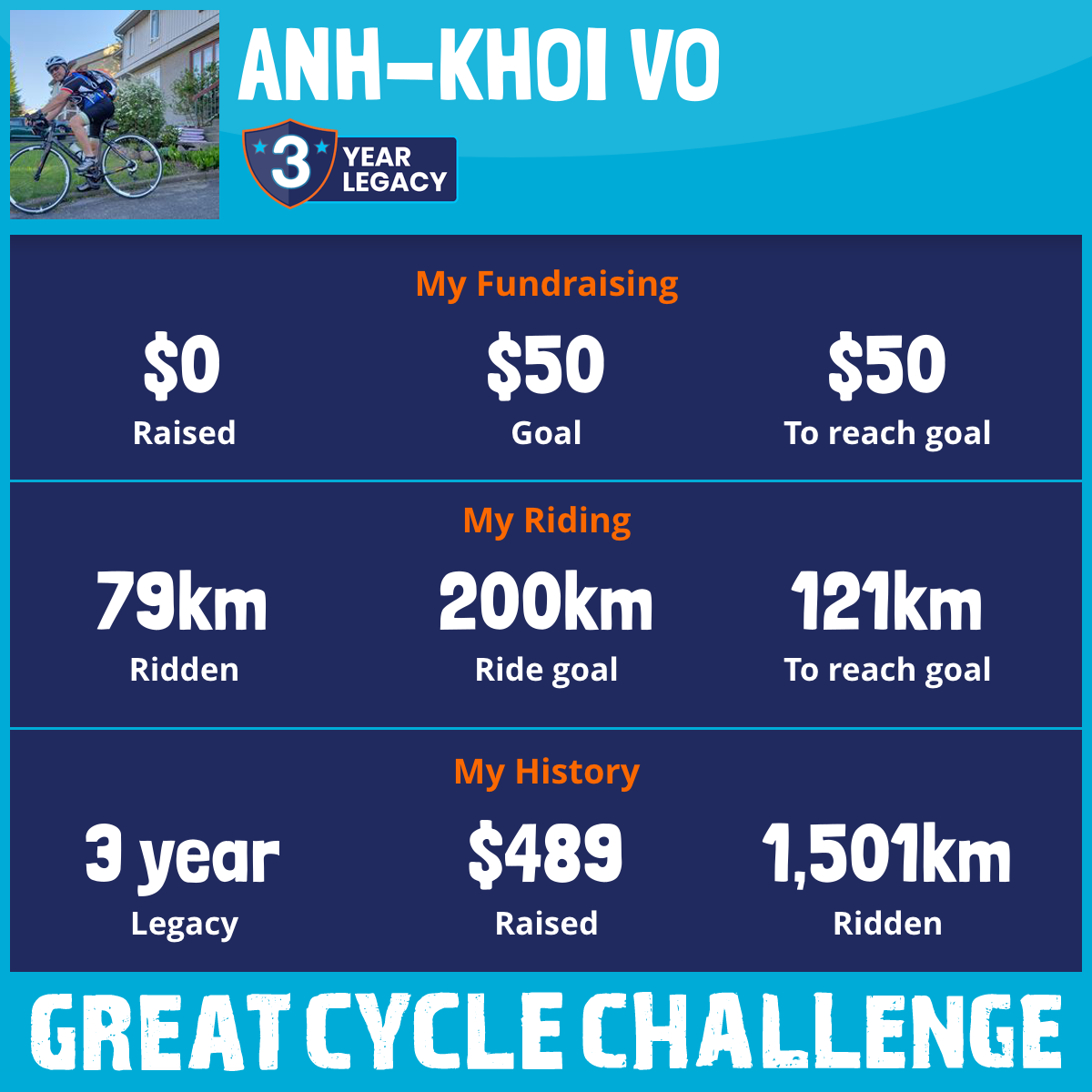 I am riding 200 km for my brother, Anh Tri Vo. Please sponsor me and support my challenge to fight kids' cancer and save little lives.