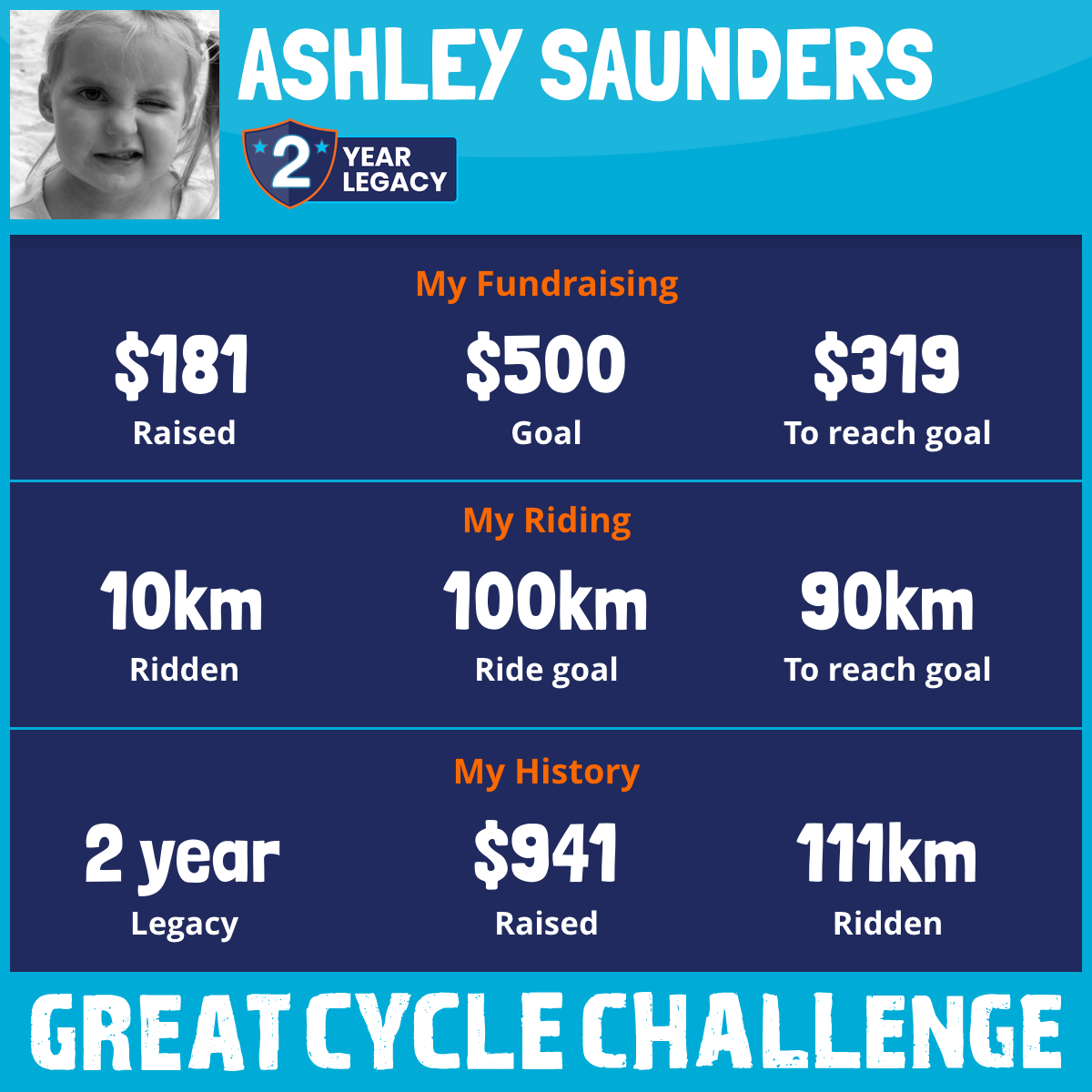 I am riding 100 km in memory of my daughter, Arwen. Please sponsor me and support my challenge to fight kids' cancer and save little lives.