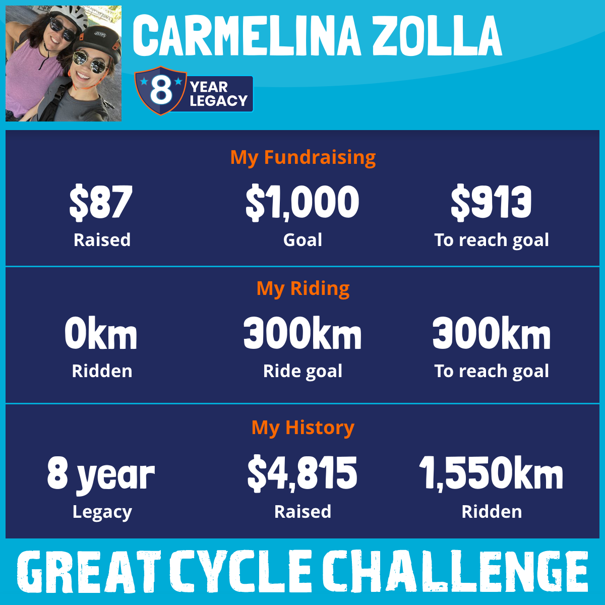301 km Ridden$1,215 Raised2026