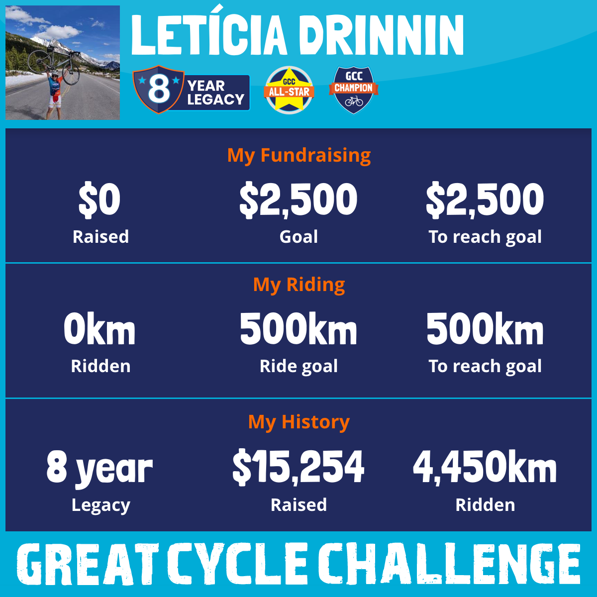 598 km Ridden$3,269 Raised2024