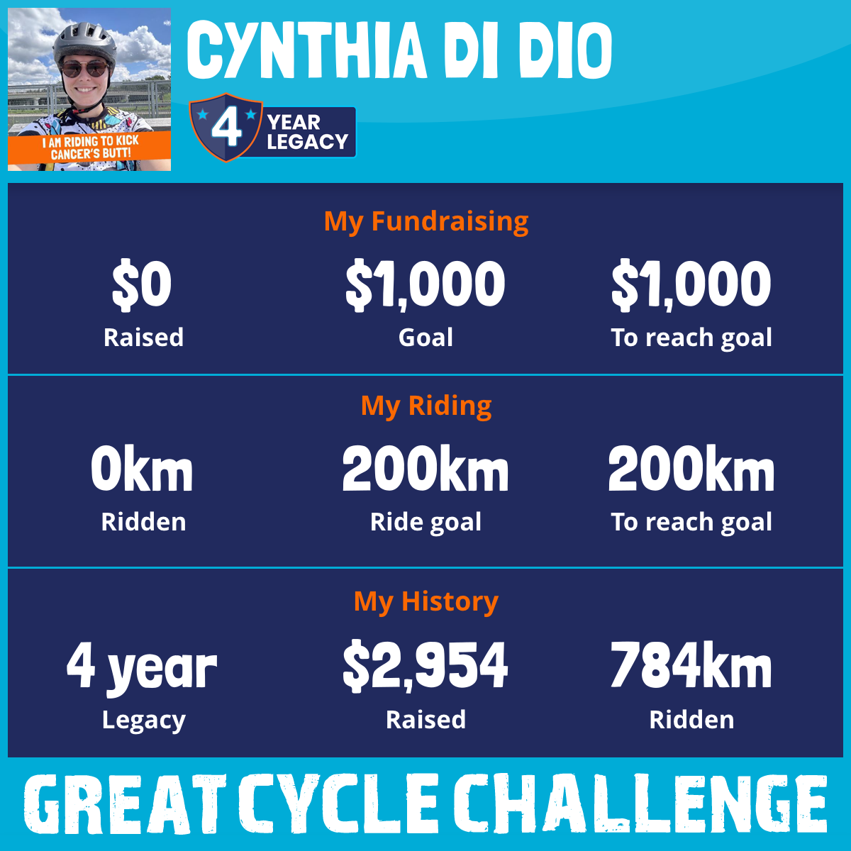 Je suis heureuse de participer de nouveau au Great Cycle Challenge Canada cette année pour soutenir la lutte contre le cancer chez les enfants. L'année dernière, grâce à votre soutien incroyable, j'ai parcouru 306 km et collecter 1 033 $ de don.