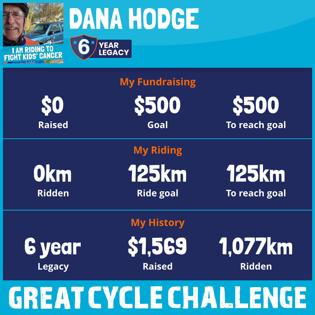 I am riding 125 km for Dana Hodge. Please sponsor me and support my challenge to fight kids' cancer and save little lives.