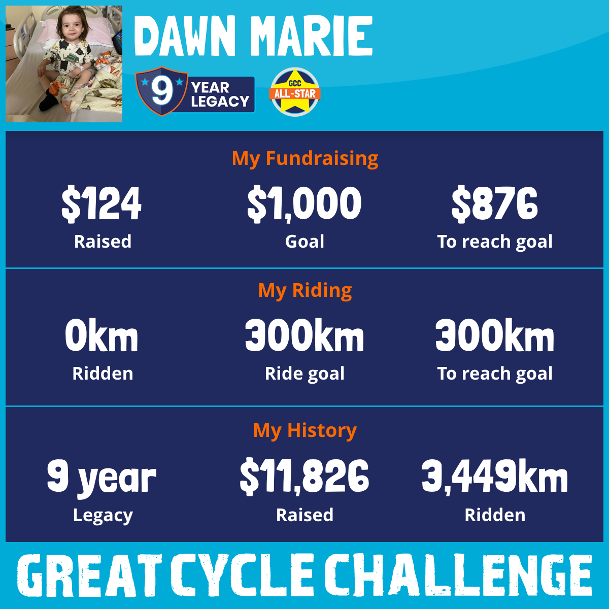 This year I am riding in honour of my little neighbour Sam. He was diagnosed in May last year with B-cell Acute Lymphoblastic Leukaemia. He is just 3! Already he has endured surgeries, blood transfusion, platelet transfusion, and has endured many rounds of chemo. He loves his mom and dad, his big brother Al, his dog Ripley and all things Buzz Lightyear and dinosaurs. Sammy and All the little ones fighting for their lives deserve the chance at a life of just being a kid. Riding bikes, getting ice cream, swimming, building sandcastles. Not fighting cancer, dealing with surgeries and chemo. I ride in honour and memory of every single child who has bravely fought cancer or is fighting for their lives now. Please support me in this ride. 300km seems so insignificant compared to the battle these children face. $1000.00 is my goal this year! Every little bit helps.