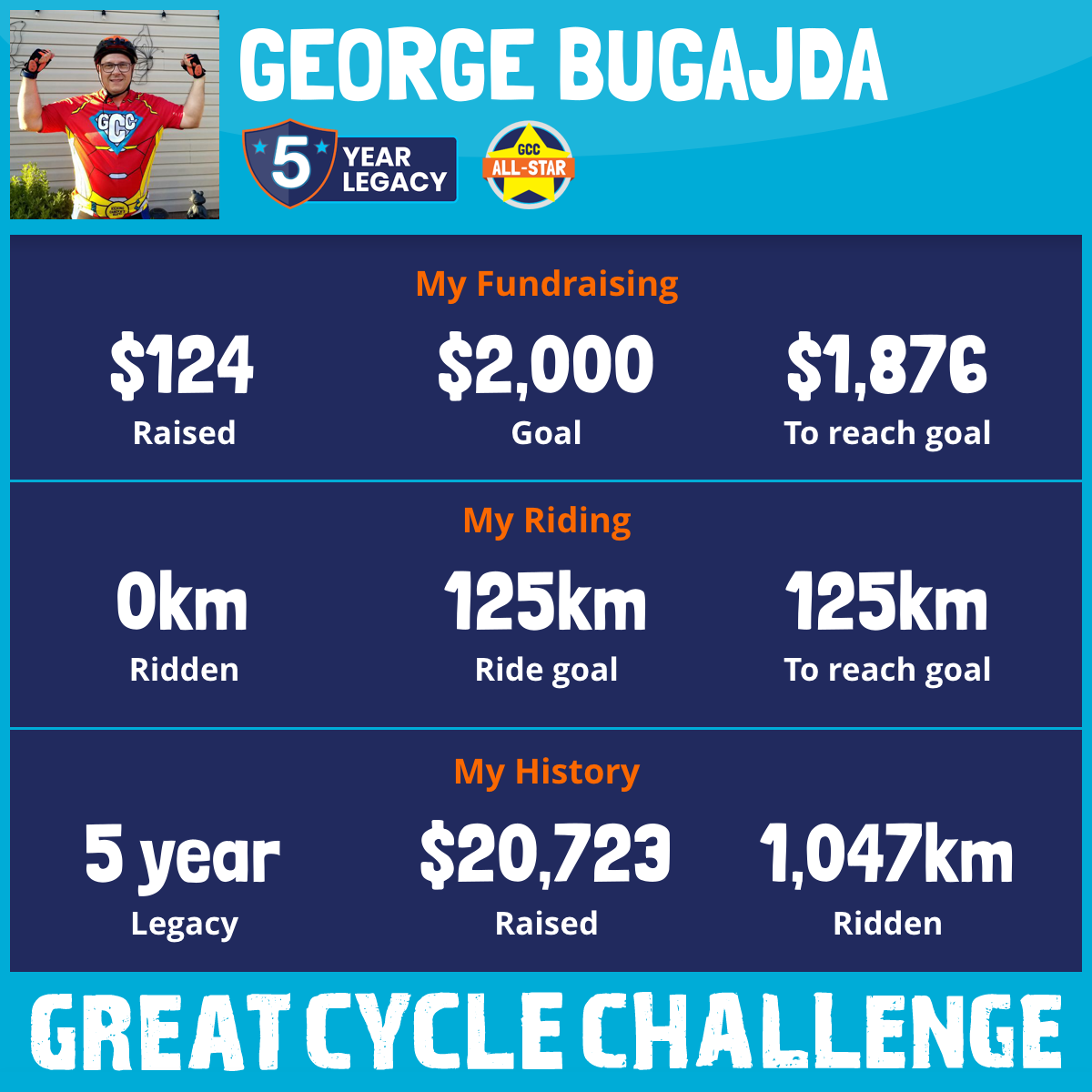 This August for a 5th. Year, I am taking part in the Great Cycle Challenge to fight kids' cancer!