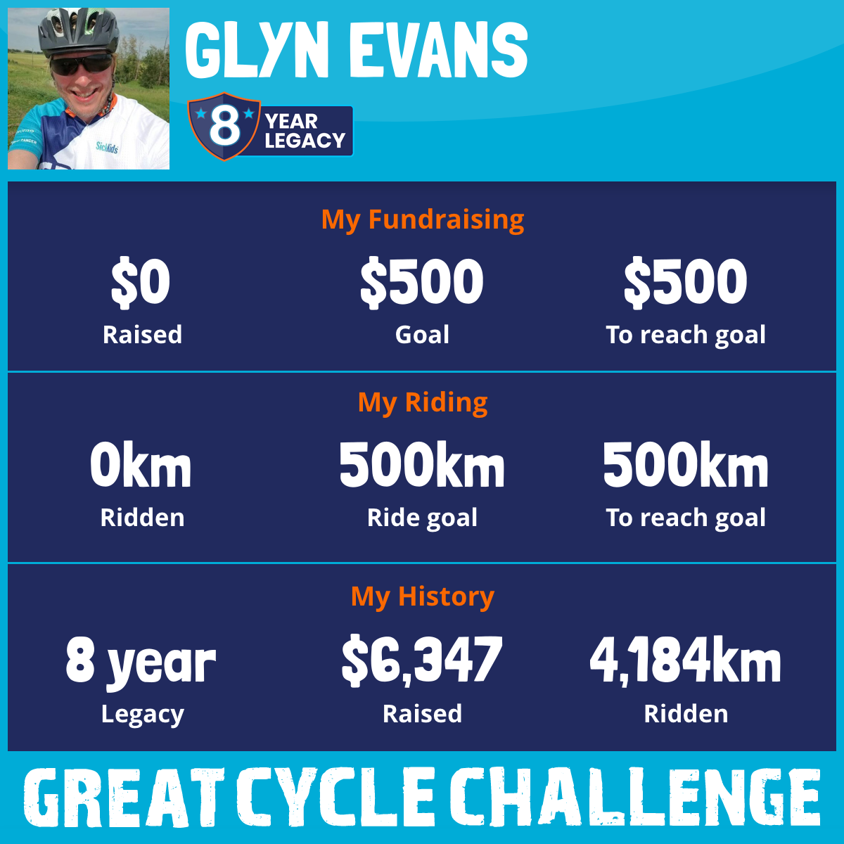 This August, I am taking part in the Great Cycle Challenge to fight kids' cancer! I have taken part for the previous 7 years, riding over 4184km and collecting over $6347 in donations for SickKids,