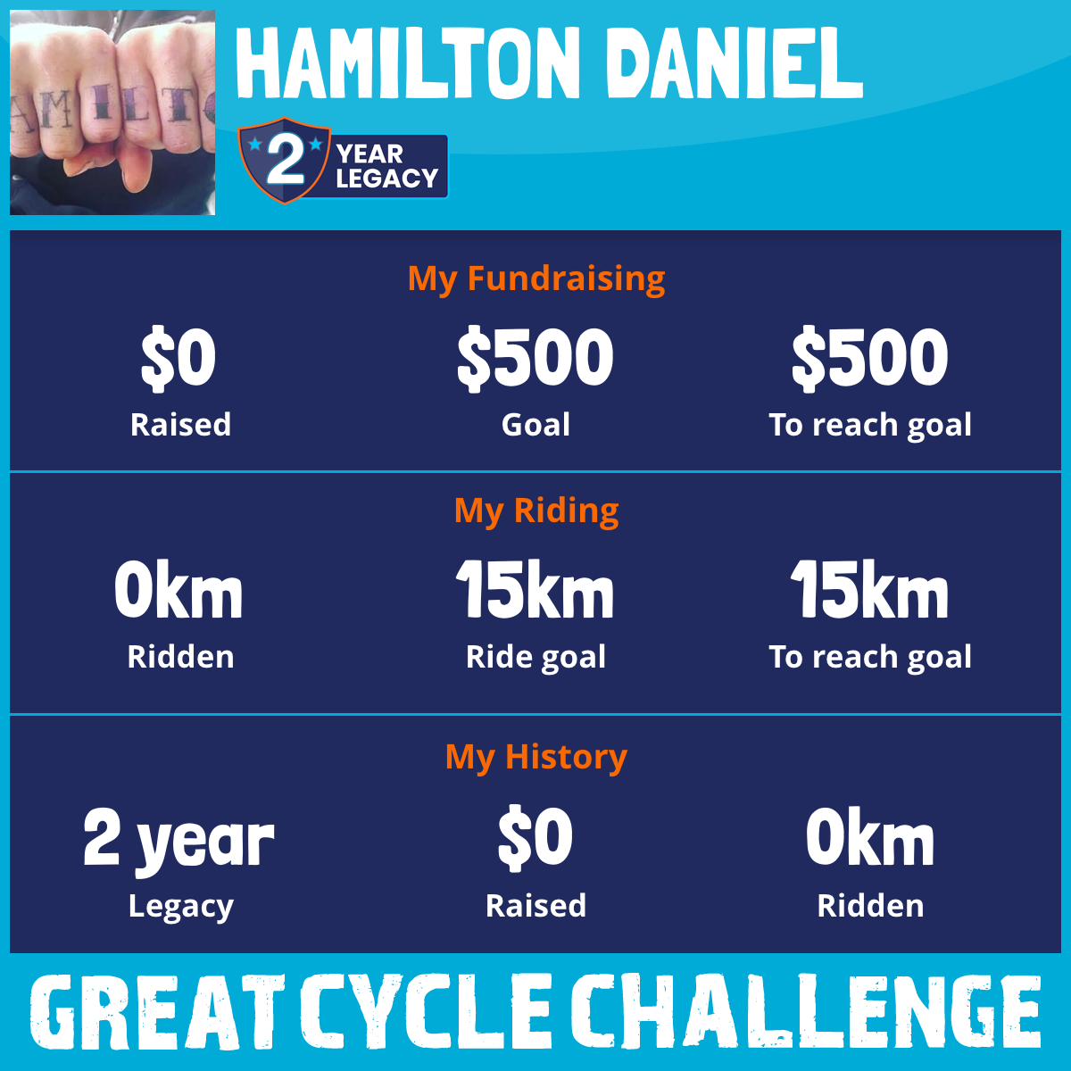 I am riding 15 km for Brian Hamilton. Please sponsor me and support my challenge to fight kids' cancer and save little lives.