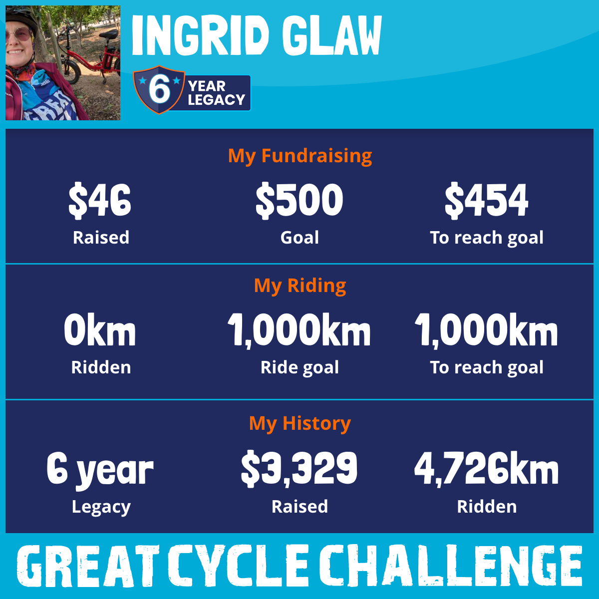 This is my 5th year doing the Great Cycle Challenge. I've raise $2694 and have ridden 3724 km.
