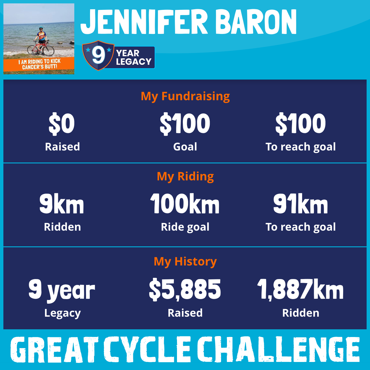 Normally I ride in memory of my mom's battle with cancer, but this year I'm going to dedicate my riding to people living with cancer. I want to send strength and honour their courage with this battle...and it is a battle. Together we can kick cancer's butt! Lots of love, Jenny.