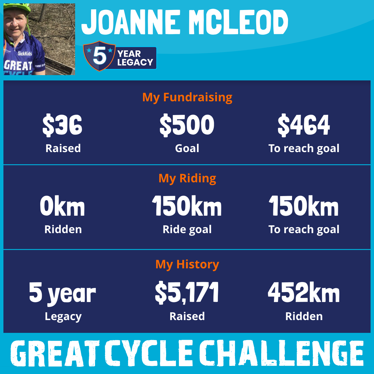 I am riding 150 km in memory of my loved one, Carolyn and all the people I have met who have journeyed with cancer. Please sponsor me and support my challenge to fight kids' cancer and save little lives.