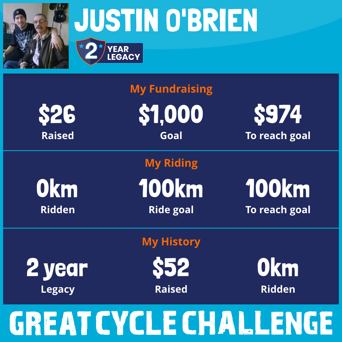 I am riding 100 km in memory of my dad, Wayne O'Brien. Please sponsor me and support my challenge to fight kids' cancer and save little lives.