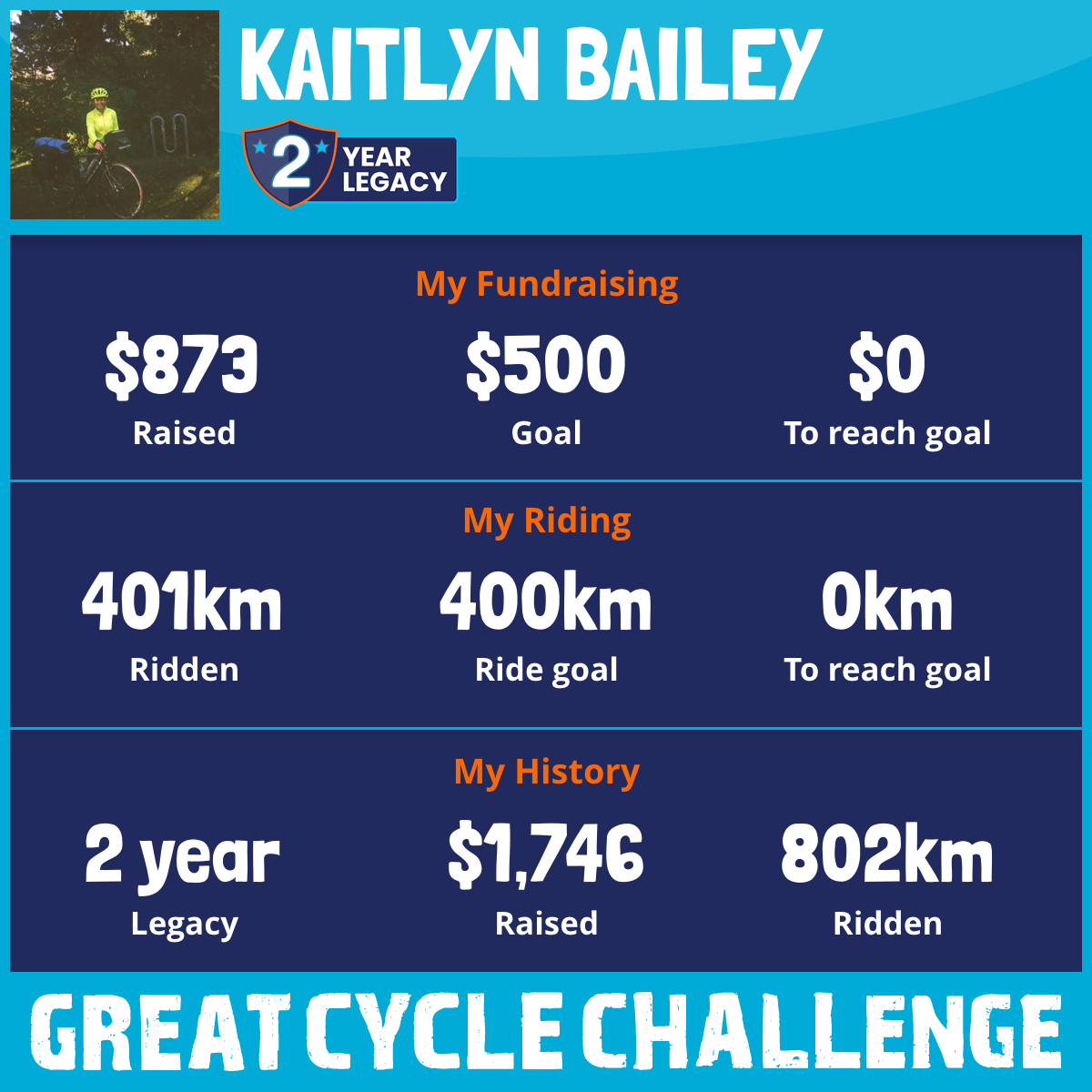 401 km Ridden$873 Raised2026
