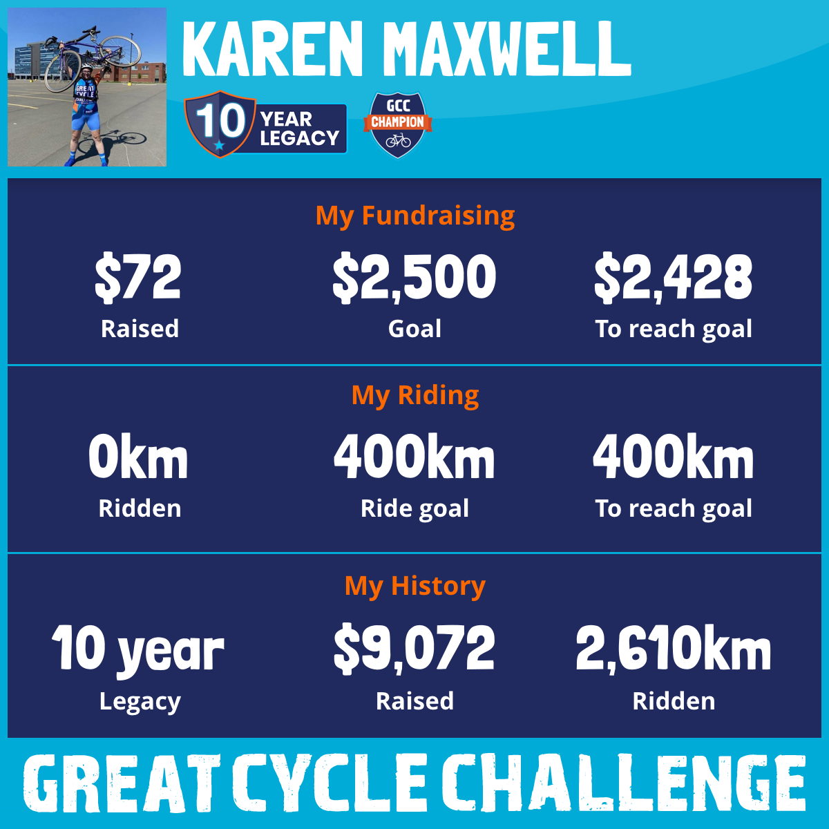 Karen has a goal to ride 400km in the month of August and to raise $1,000 from friends and family along the way.