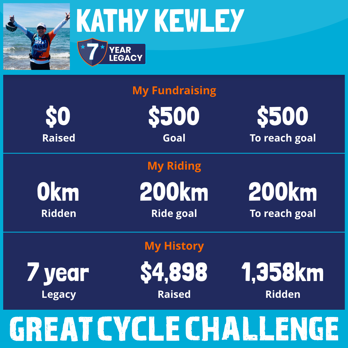 “Thank you to all that support me on this Great Ride to support Childhood Cancer. Cheers! Kathy Kewley”