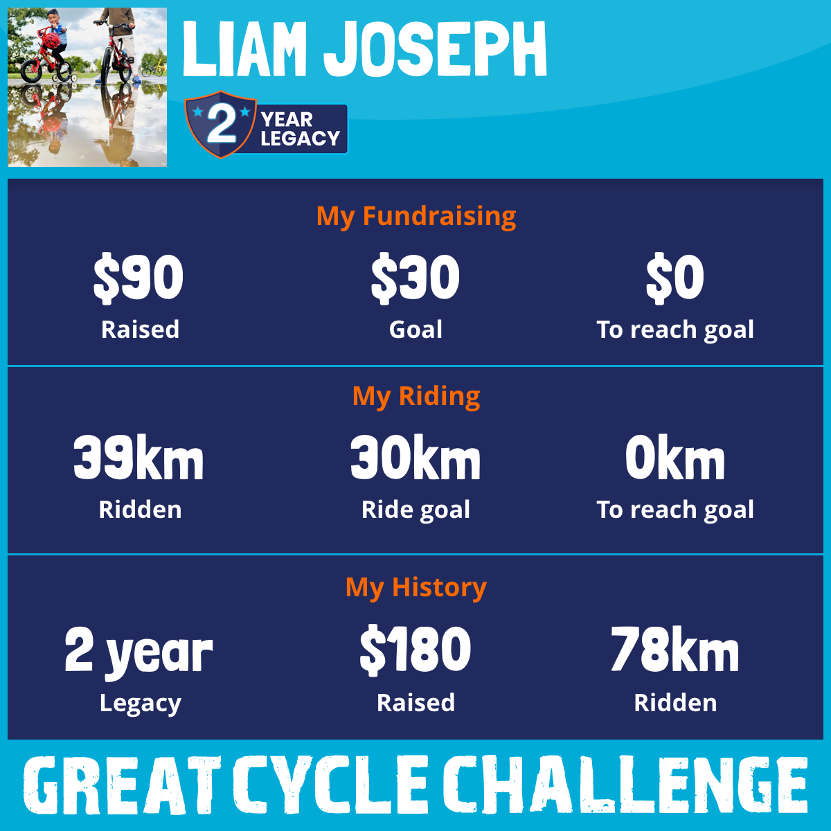 My name is Liam. I’m 4.5years old. This August for the first time, I am taking part in the Great Cycle Challenge to fight kids' cancer! My goal is to ride 30km in the month of August and raise $30.