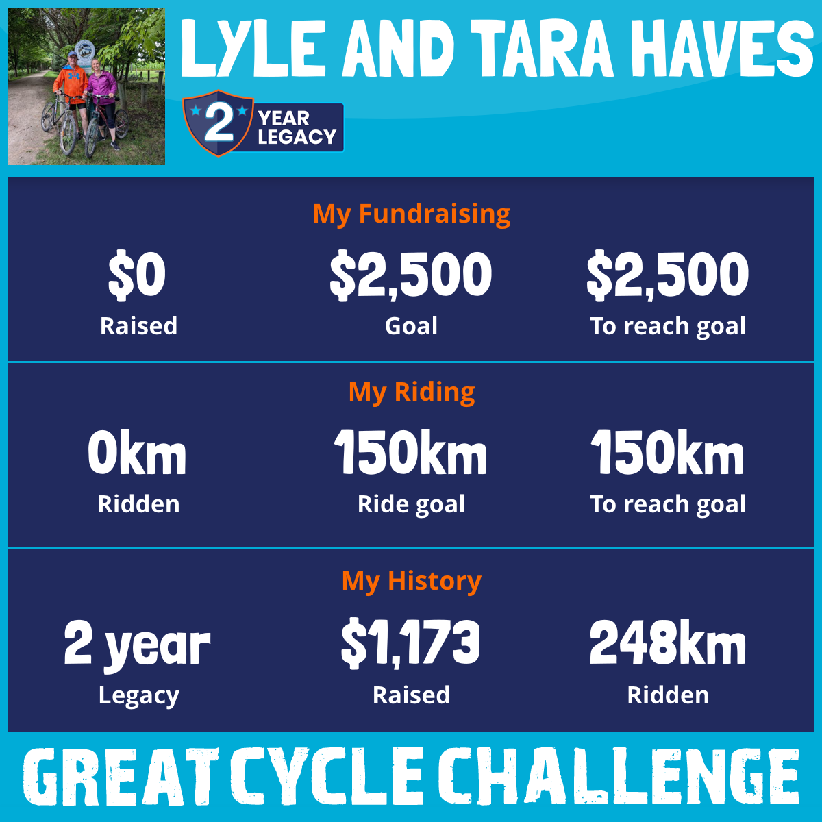 This August, Lyle and I thought we'd take part in the Great Cycle Challenge a second time to fight kids' cancer.