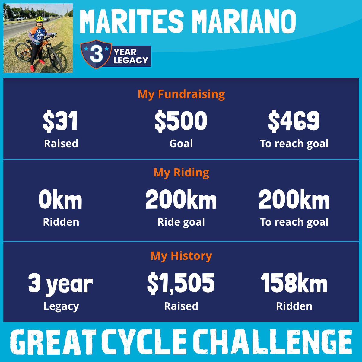 This is my 3rd year joining the Great Cycle Challenge to fight kids Cancer. I’m riding in memory of my mom and father in law who died with cancer. Please support me by making donations to help these kids to fight cancer. Thank you.