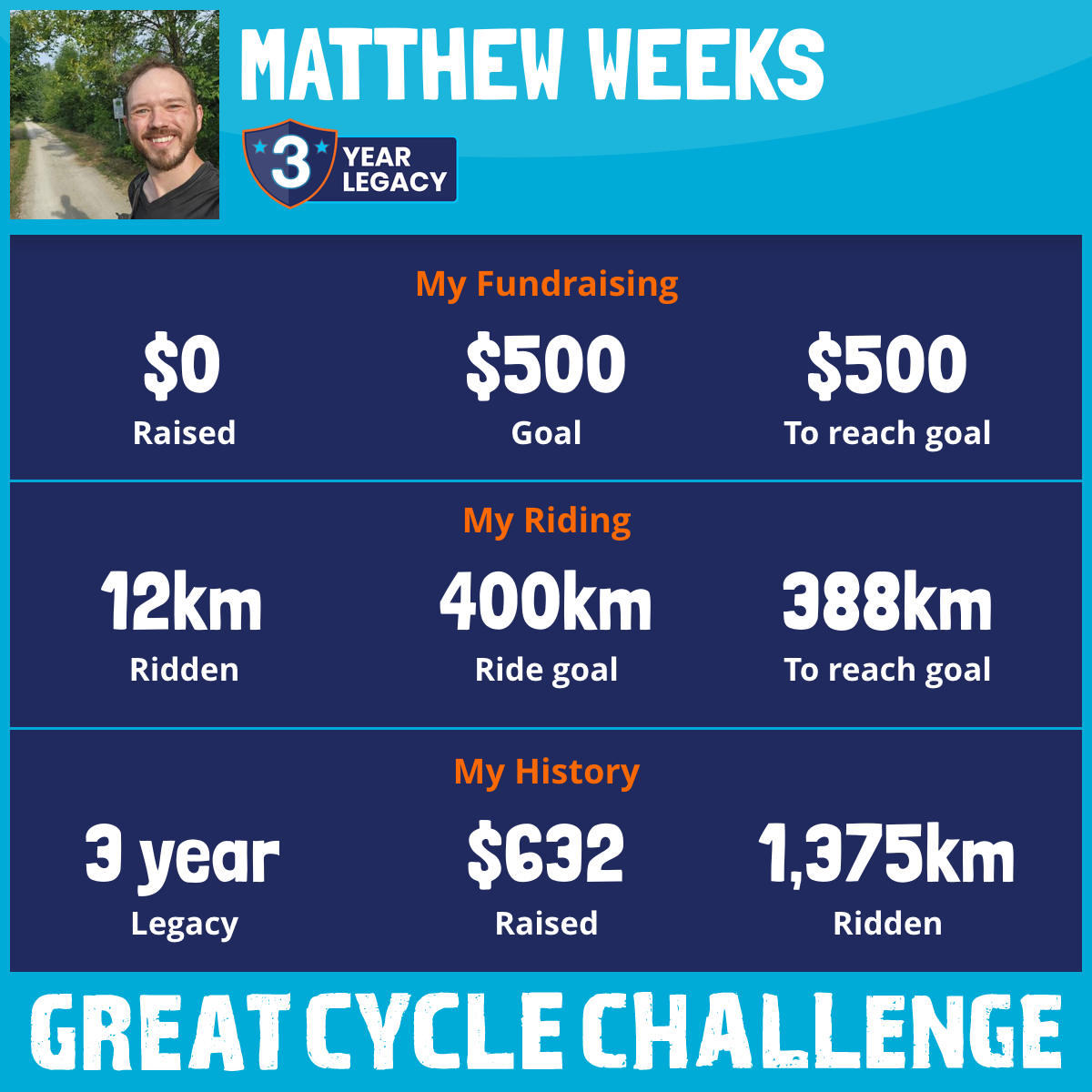 I am riding 400 km in memory of Greg Weeks. Please sponsor me and support my challenge to fight kids' cancer and save little lives.
