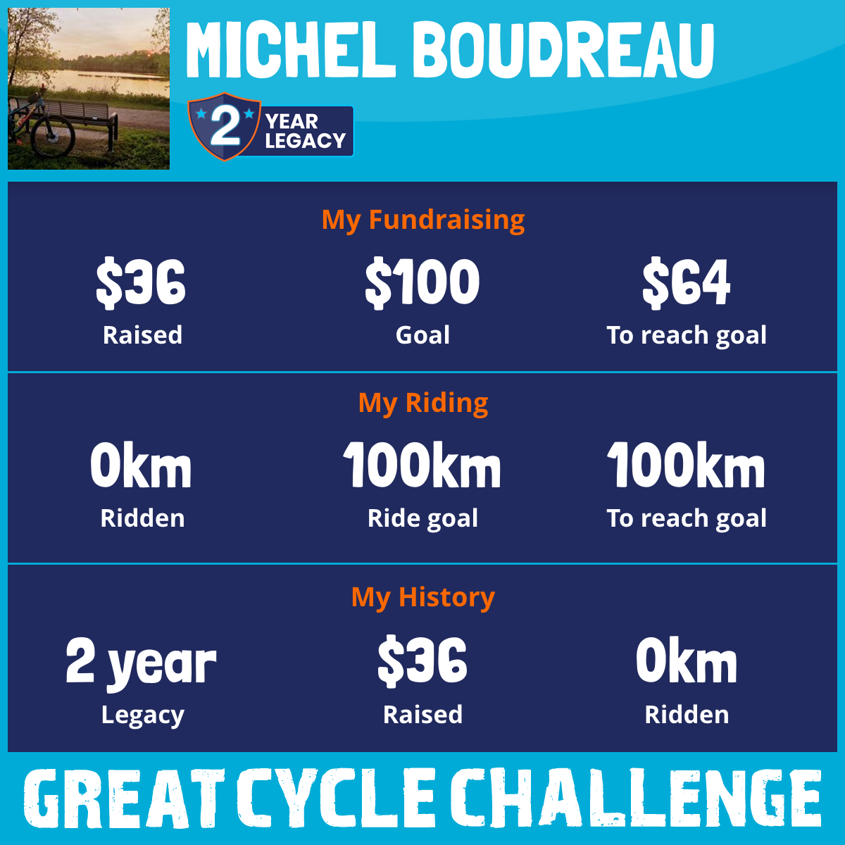 I am riding 100 km in memory of my dad, André Boudreau. Please sponsor me and support my challenge to fight kids' cancer and save little lives.