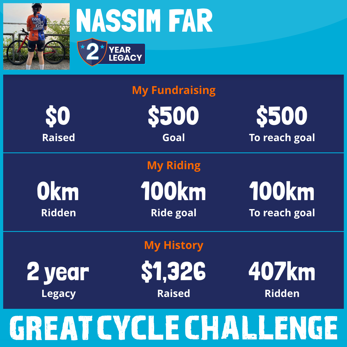 This August, I'm back on my bike for my second year to fight kids' cancer. It's a cause that means a lot to me, and I'm pushing myself to cycle 200 km to help these brave kids.