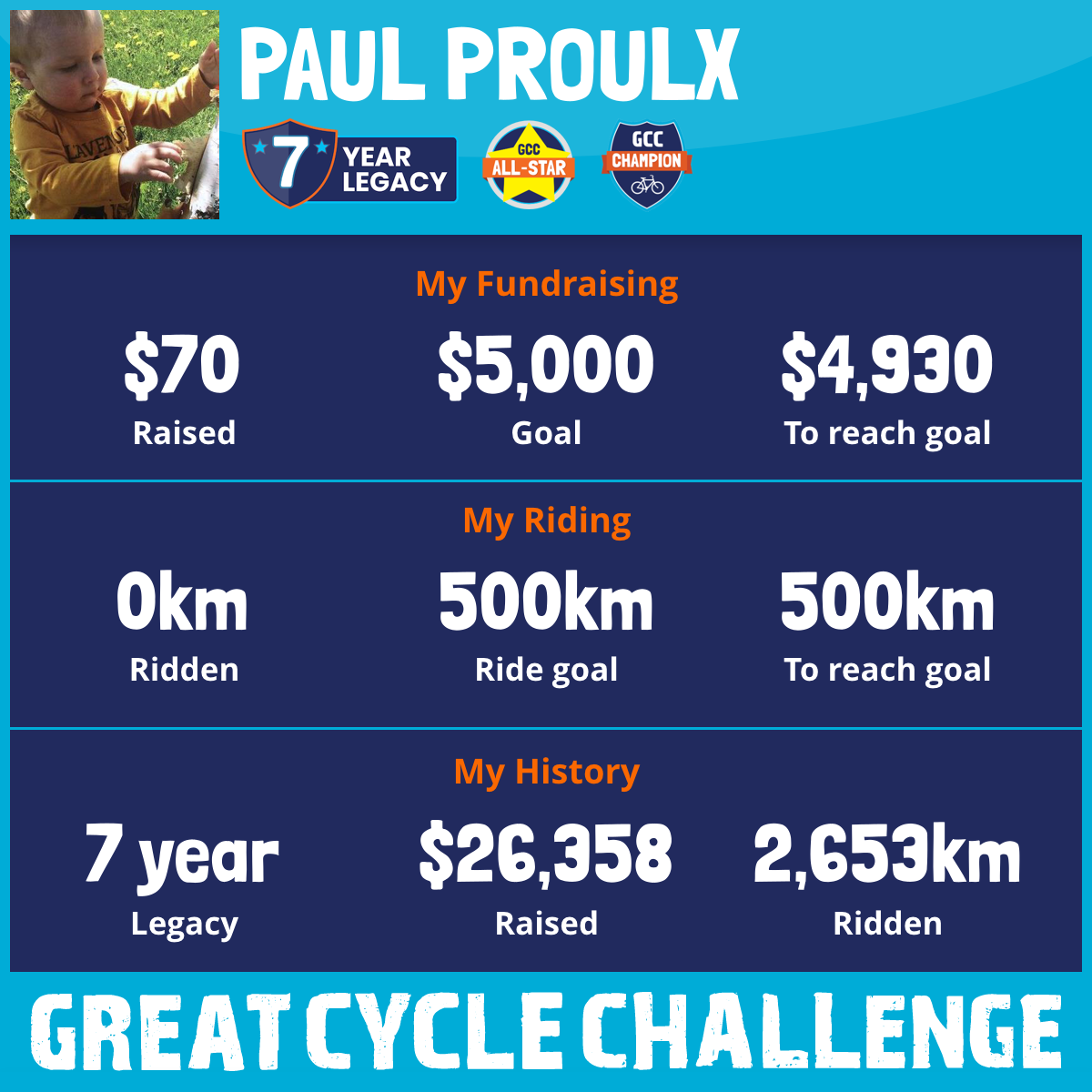 This is year 7 for me with GCC and I am again challenging myself to riding 500 km and raising $5000. I will need your help and encouragement!