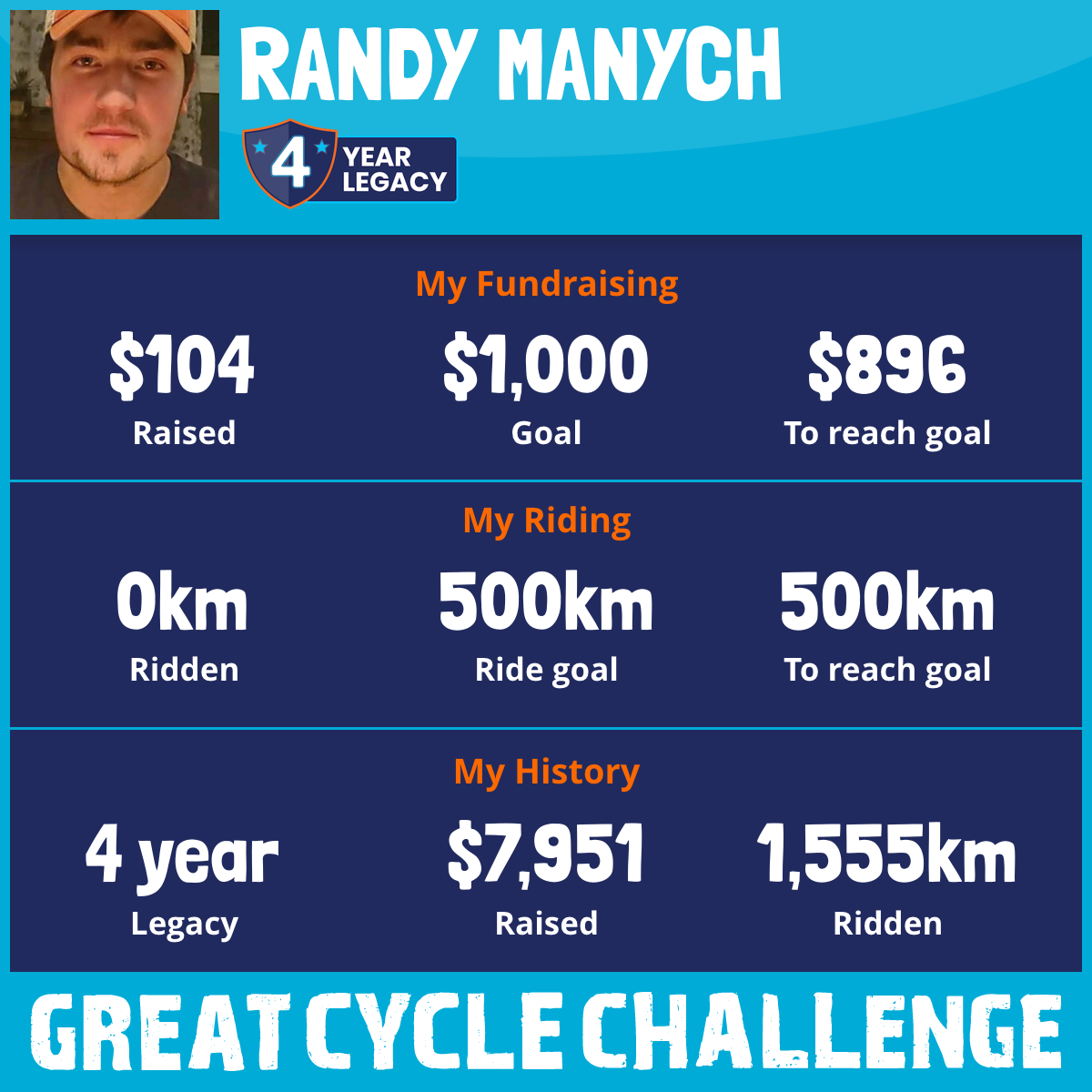 I am riding 500 km in memory of RILEY MANYCH - No parent should lose a child. Please sponsor me and support my challenge to fight kids' cancer and save little lives.