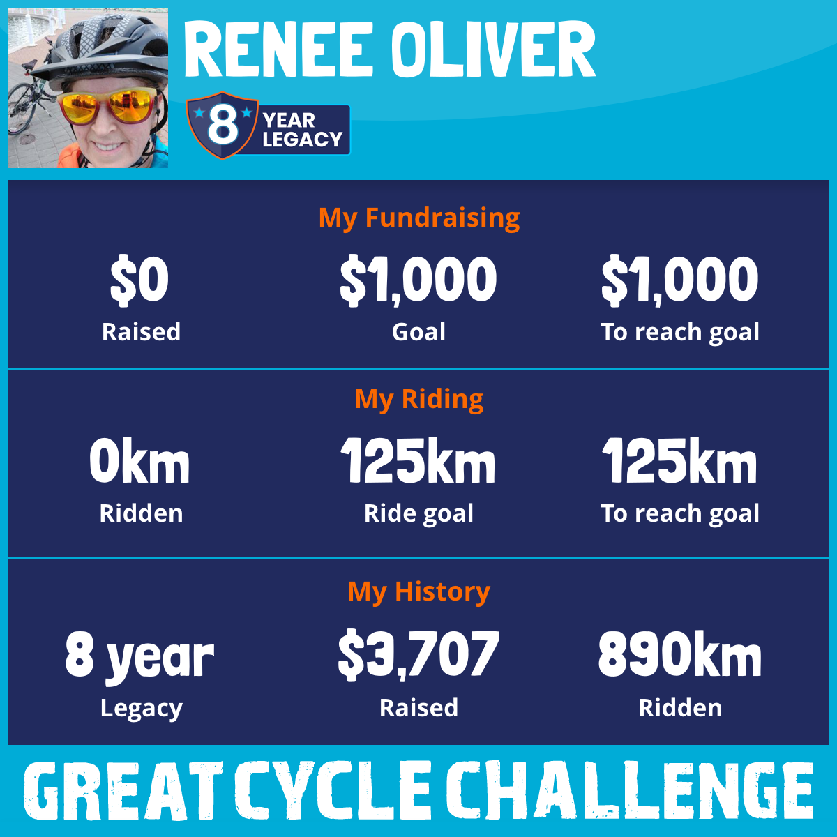 This August, I am taking part in the Great Cycle Challenge to fight kids' cancer! I can hardly believe that this is the 8th year that I have been riding for this cause. Please help me reach my goal in fundraising. Any amount will help.