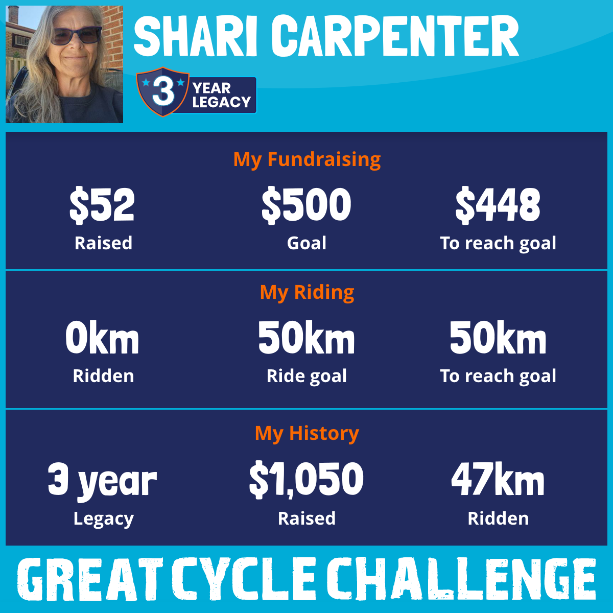 I am riding 50 km for my friend, Shelly. Please sponsor me and support my challenge to fight kids' cancer and save little lives.