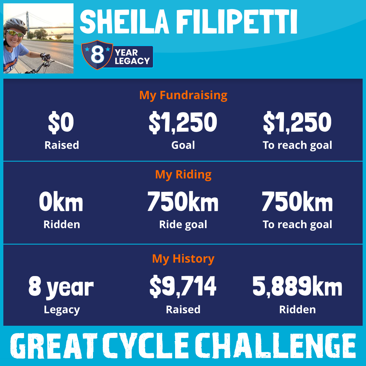 This August, I'll be participating in the Great Cycle Challenge for my 9th year. I come back each summer because cancer is the biggest killer of children from disease in Canada. It’s heartbreaking to know that over 1,000 Canadian children are diagnosed with cancer every year. Kids should be living life, not fighting for it!