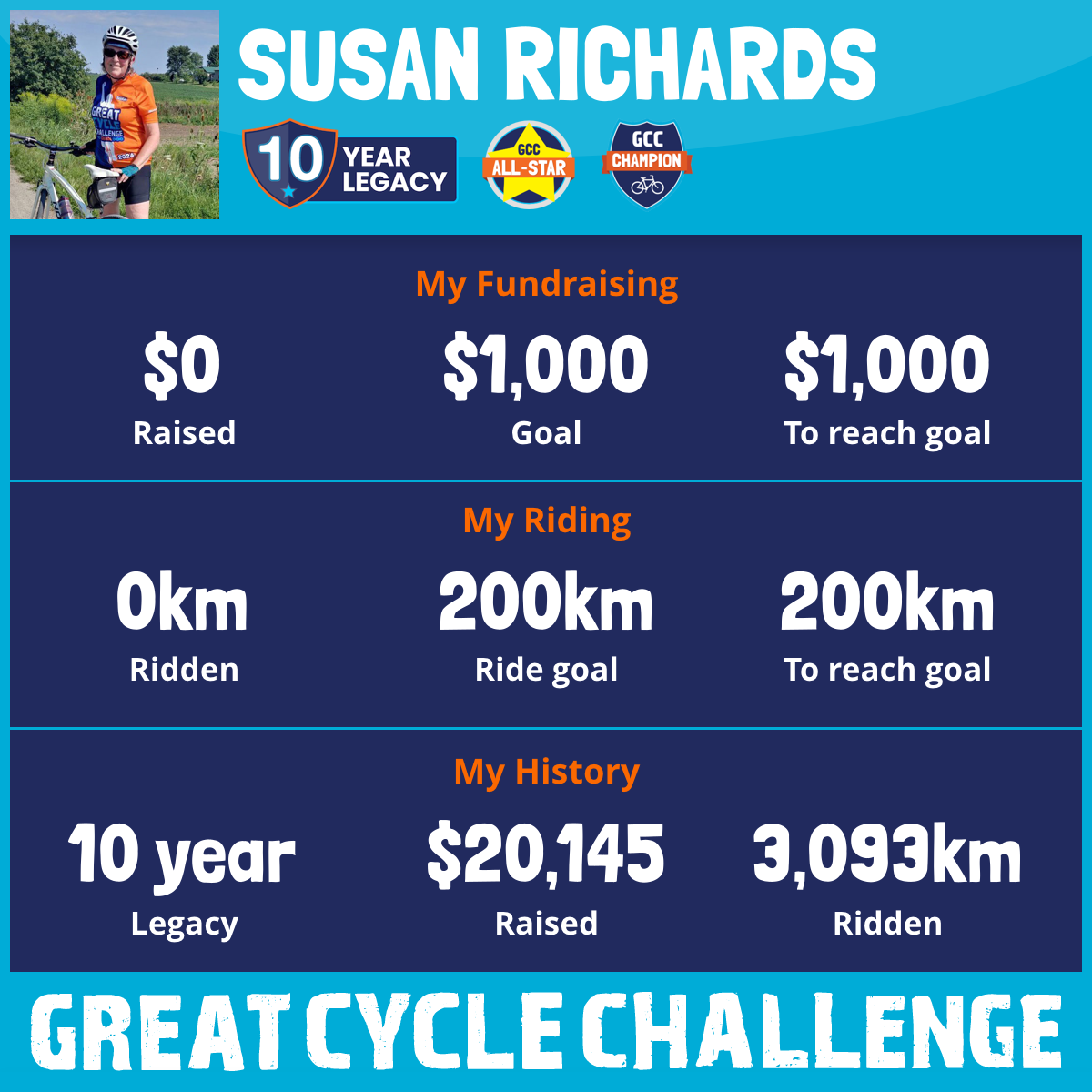 This year I’m dedicating my ride to my husband and usual riding mate Doug. Doug has been fearless in his bout with prostate cancer. A dedicated cyclist, he is working hard at his recovery in order to get back on his bike in time to ride alongside me in August. Cancer can strike anyone. Please support my ride so a child can be spared.