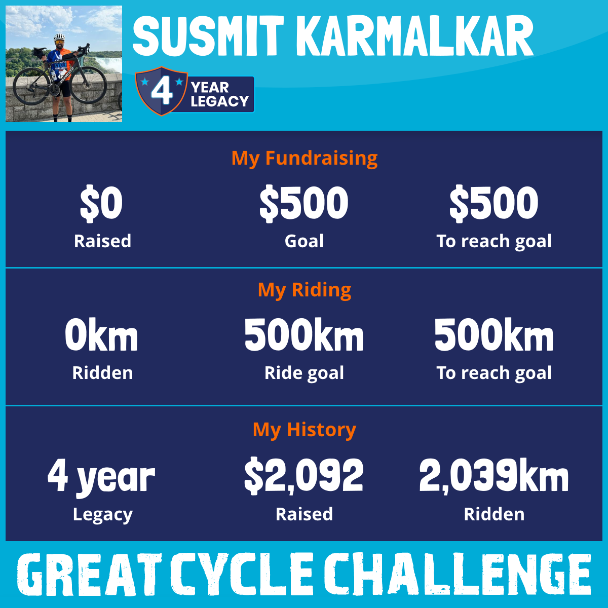 This is my 4th year in this challenge and I wish to continue for this amazing institution which works to better health of sick children. I feel fortunate to be associated with this institute and I am inspired by the work they do for health and wellbeing of children. I am blessed that myself and my closed ones haven't been touched by this deadly disease but I want to support Sickkids Foundation for this great cause, so I am here to ride and raise as much funds I can for this wonderful event. Everyone here is doing a wonderful job at this challenge. Kudos to every individual participant, team & sponsors