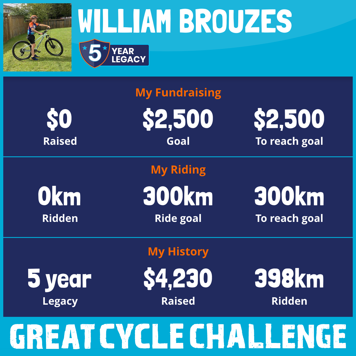 I’m Will, I’m 12, and this is my 5th year riding for cancer! This year I have big goals, help me reach them! Donate if you can, and wave if you see me riding!